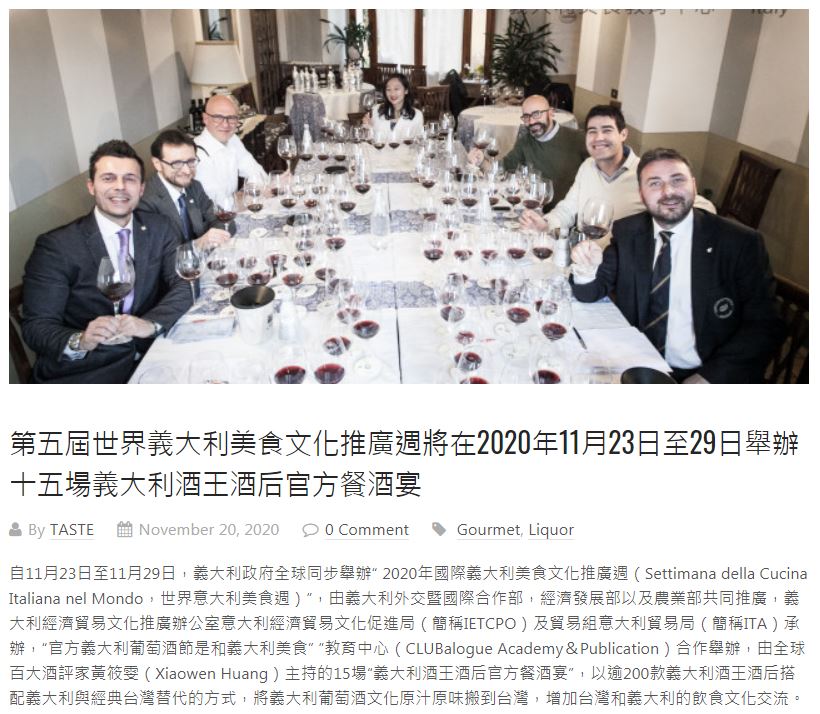 第五屆世界義大利美食文化推廣週將在2020年11月23日至29日 舉辦十五場義大利酒王酒后官方餐酒宴